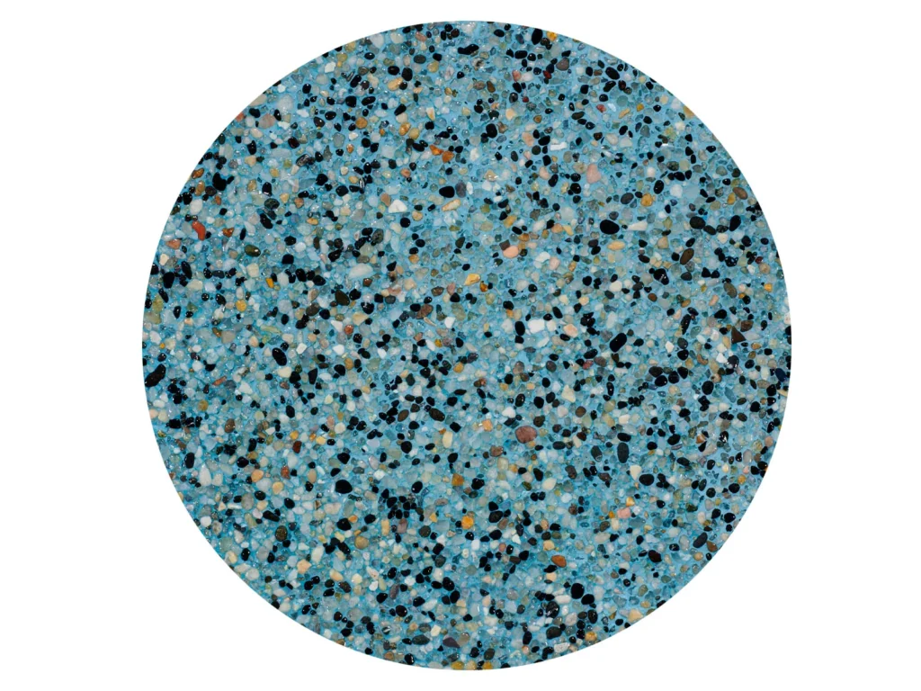 Mini Pebble Aqua Blue from Crystal Stones defines the color and clarity of the water itself. The refined pebble texture offers durability and comfort underfoot while giving the pool interior a luminous, natural appearance. Its aqua tone enhances the water’s brightness and harmonizes with the surrounding tiles and materials.